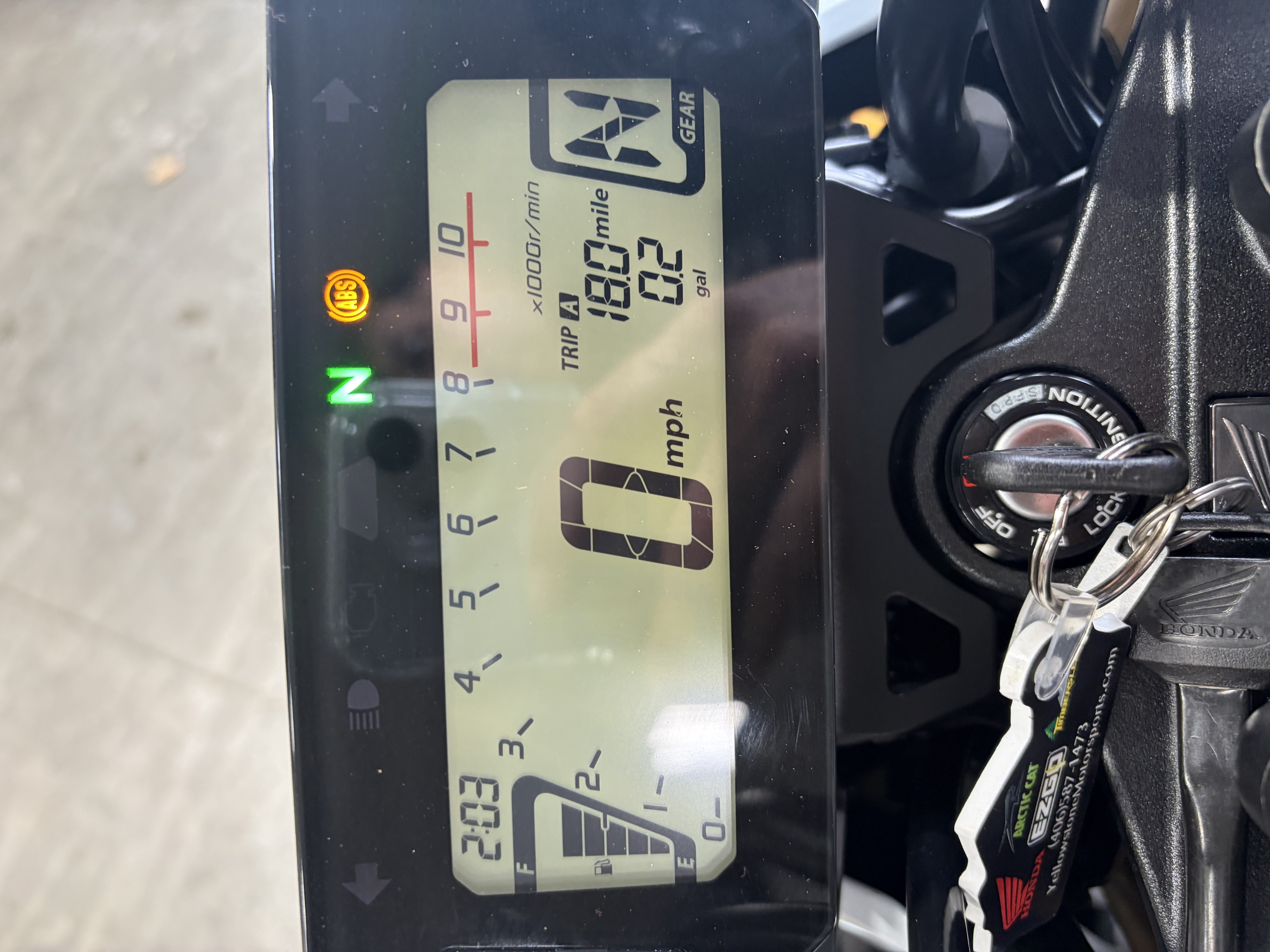 The instrument display includes a speedometer, odometer, tachometer, gear position indicator, A&B trip meters, fuel gauge, clock, and low/high beam indicator.